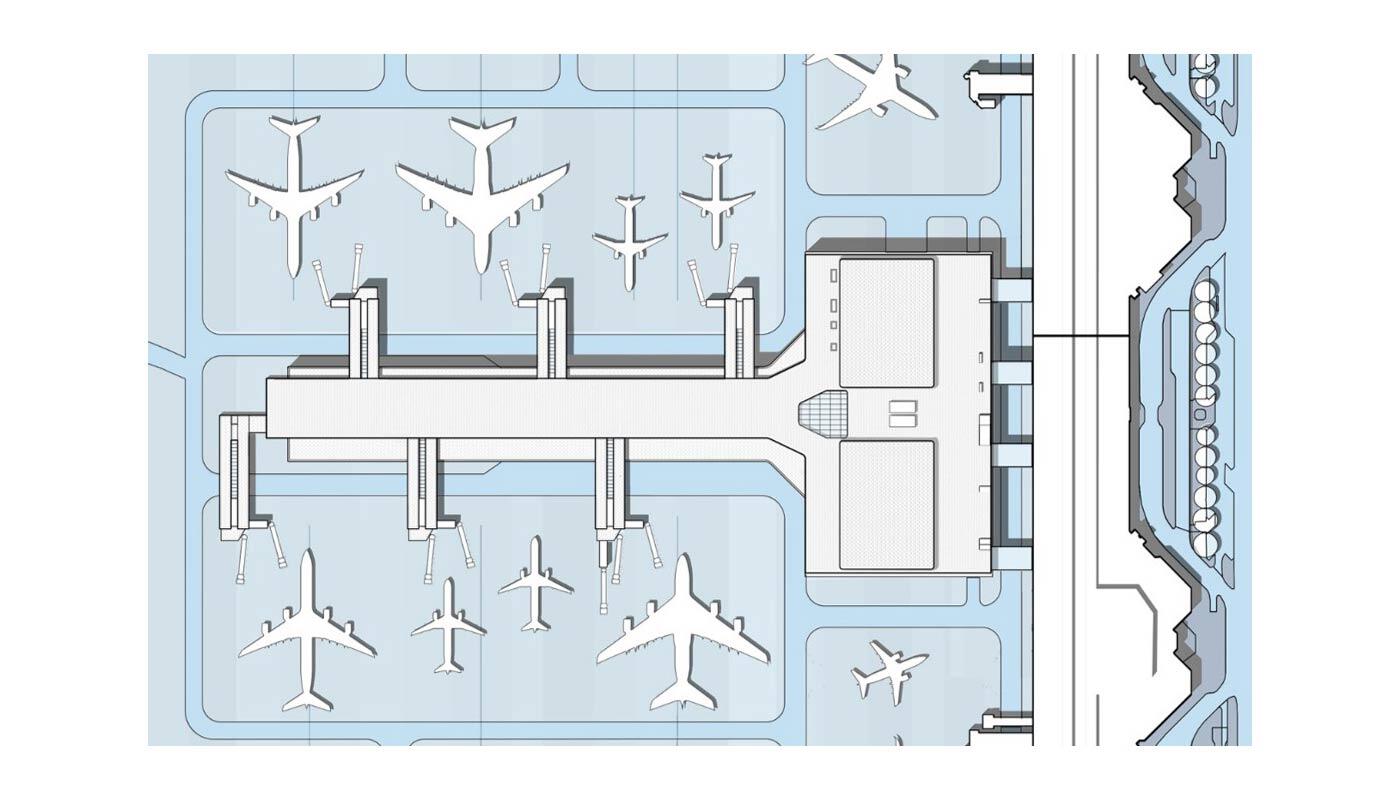 • Der neue Pier wird mit den heutigen Modulen A und B des Terminals 1 über vier Brücken verbunden sein und rund 360 Meter in das westliche Vorfeld hineinreichen. An der Erweiterung können zukünftig bis zu zwölf Flugzeuge andocken. © Planungsgemeinschaft T1E: SSF/ SP/sop/JSK