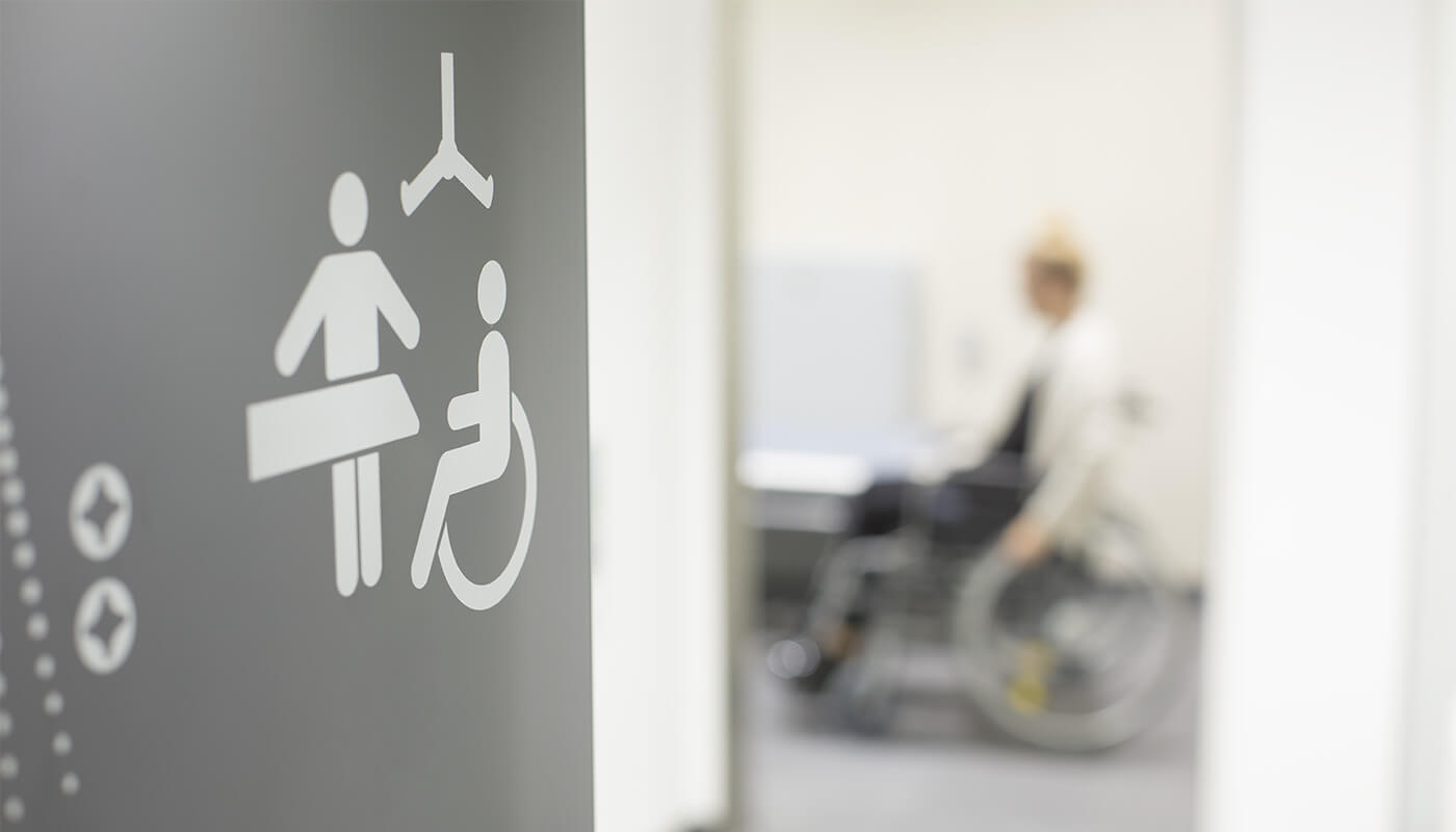 A special toilet for people with serious or multiple disabilities is located in the Munich Airport Center (Level 03). The 14 square meter room is equipped with a height-adjustable gurney with side safety rails and a ceiling-mounted lift. This equipment will enable you to transfer easily from the wheelchair to the gurney or toilet.