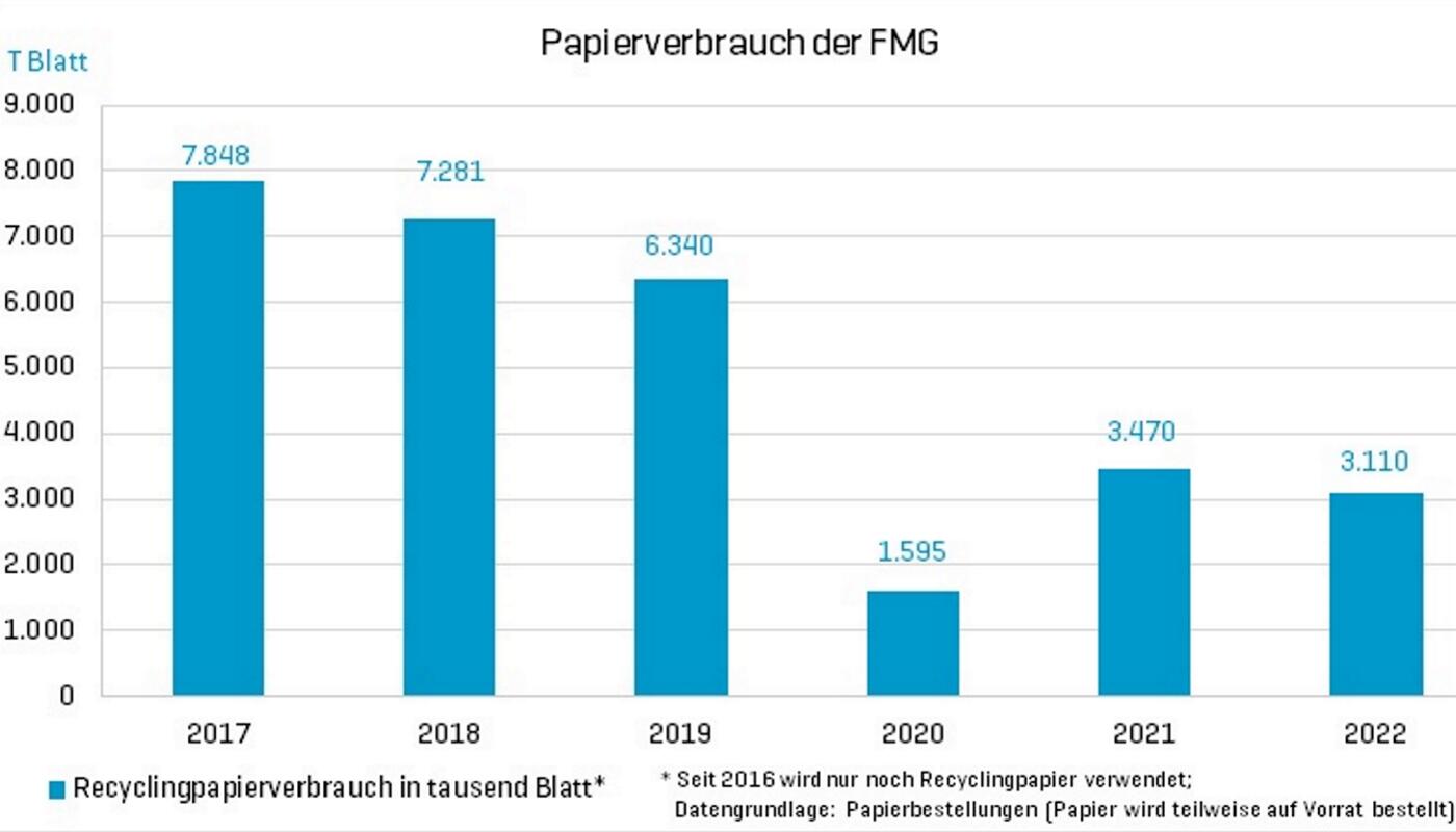 Paper consumption obviously decreased significantly during the coronavirus pandemic in 2020. There were hardly any aircraft movements at the airport. The staff was in short-time work or working from home; hardly anyone was in the offices. In 2021, the number of passengers increased again, as did the number of employees working in the offices. Paper consumption therefore also increased. In 2022, paper consumption fortunately decreased again, even though both aircraft movements and office occupancy increased further.