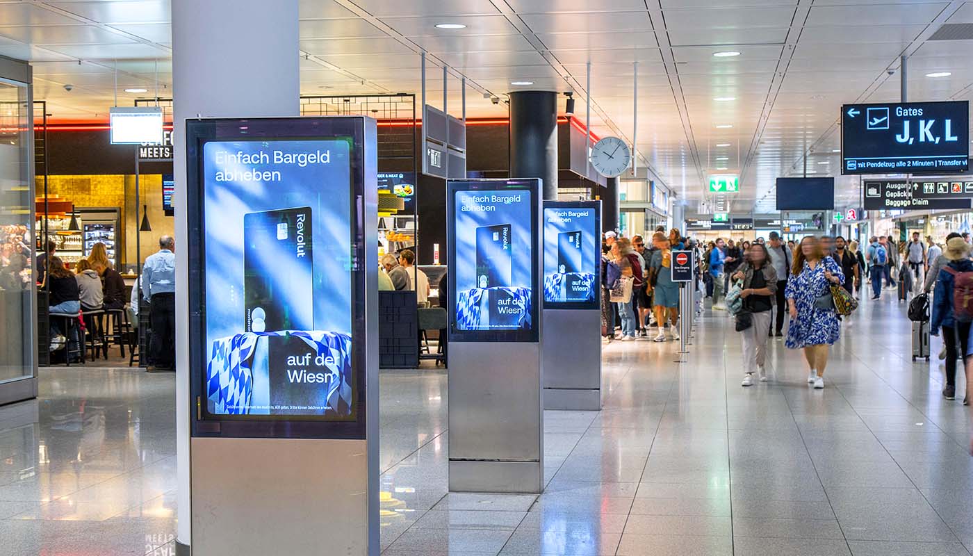 Mehr als 700 Werbeflächen sind strategisch entlang der gesamten Passenger Journey positioniert – von der Ankunft am Parkhaus bis zum Gate sowie von der Landung bis zum Verlassen des Flughafens. Die Auswahl reicht von klassischen CLPs und Leuchtkästen über digitale Stelen und Welcome Boards bis hin zu Flächen für Sonderinszenierungen – in diesem einzigartigen Umfeld werden Marken nicht nur sichtbar, sondern erlebbar gemacht.