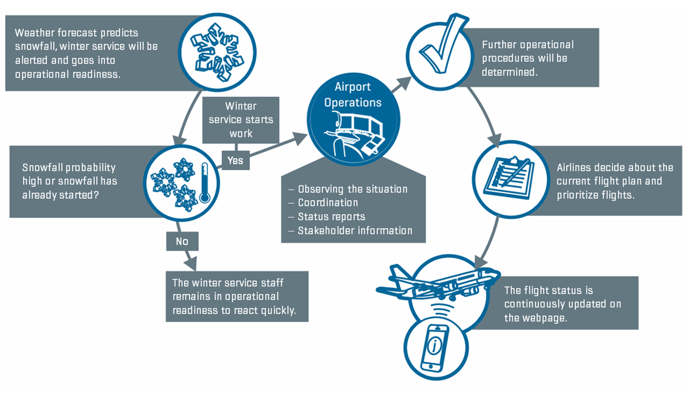 In case of snowfall, an essential task of our Winter Services crews is to keep runways free of snow and ice. Unlike cars, aircraft cannot adjust to slippery conditions by taking off and landing more slowly. In addition, the taxiways and aircraft handling areas on the apron need to be ready for use at all times.